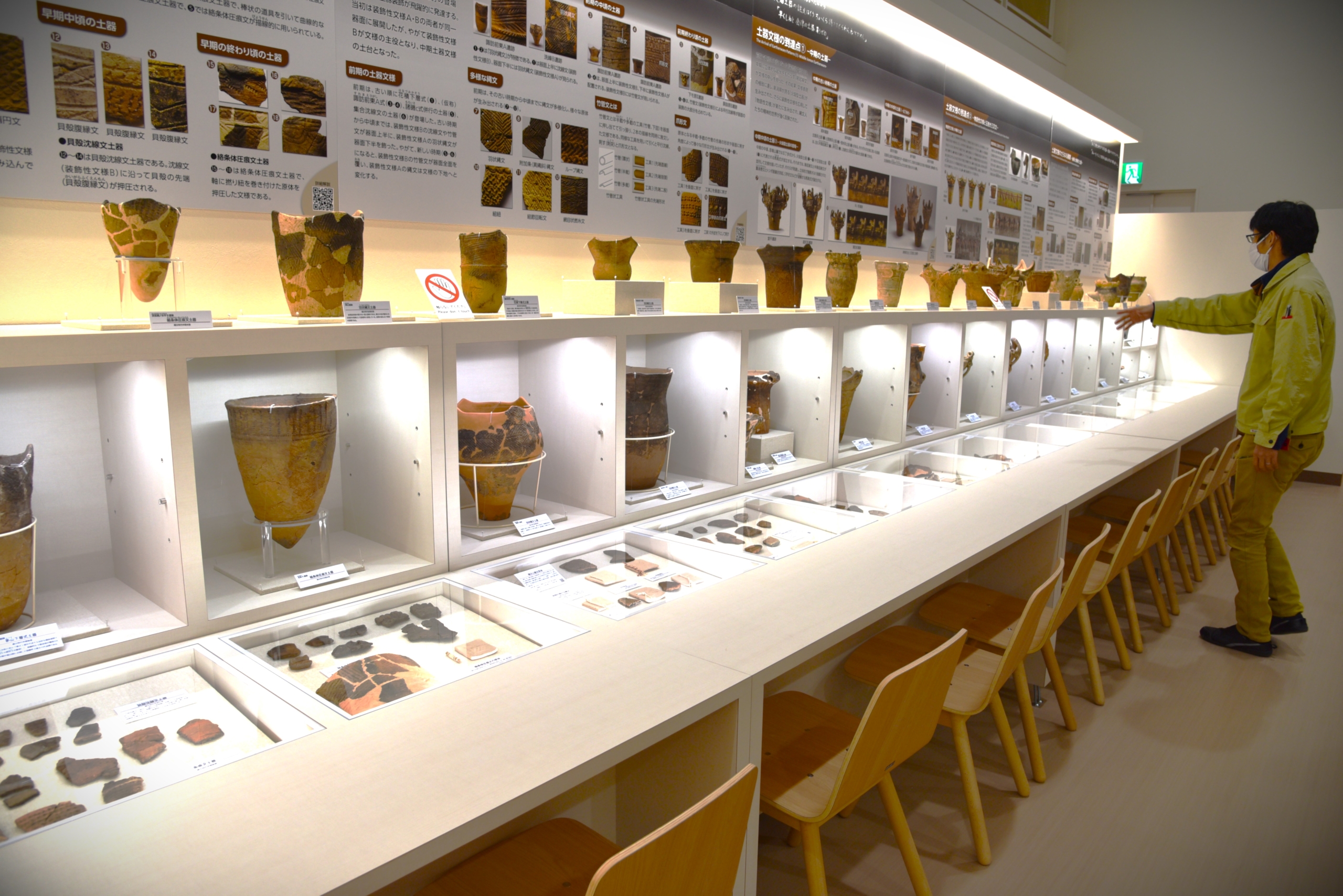 「とくに縄文時代に関しては草創期、早期、前期、中期、後期、晩期の6区分に分け、それぞれの時代の土器など埋蔵物を展示しています」(佐藤さん) 展示されている土器や道具類のすぐ手前にイスが並んで置かれていて、そこで座ってじっくりと展示物と向き合うことができる。遺跡や埋蔵物が好きな人にはたまらない空間だろう。「実際、長いこと座って見られている方もいらっしゃいます」と佐藤さん。実物とこれほど近い距離で対面できる機会はそれほど多くはない。それだけでも価値ある展示だと実感できる。