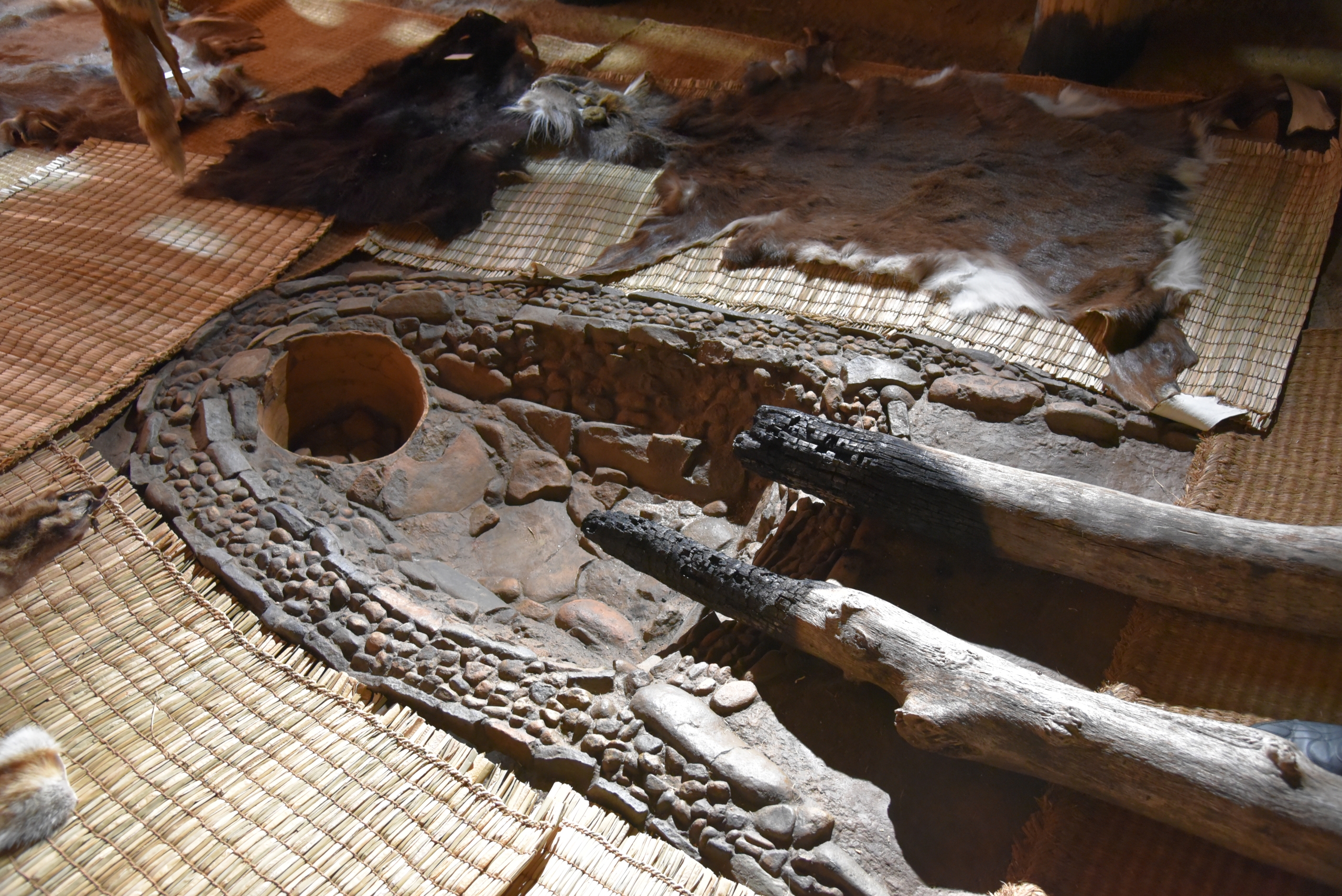 足元を見ると中央に小さな石で組まれた細長い楕円型の窪みがある。「これが当時の囲炉裏です。小さな石をモザイク状に敷き詰め内縁を覆い、その中で木をくべました。楕円の先に土器が埋められていて、煮炊きに利用されたと思われます」と佐藤さん。この囲炉裏は発掘現場でそのまま型取りをして忠実に再現したものだという。ここで火をたいた煙が自然に上に昇り、天井の穴から排出される仕組みだという。