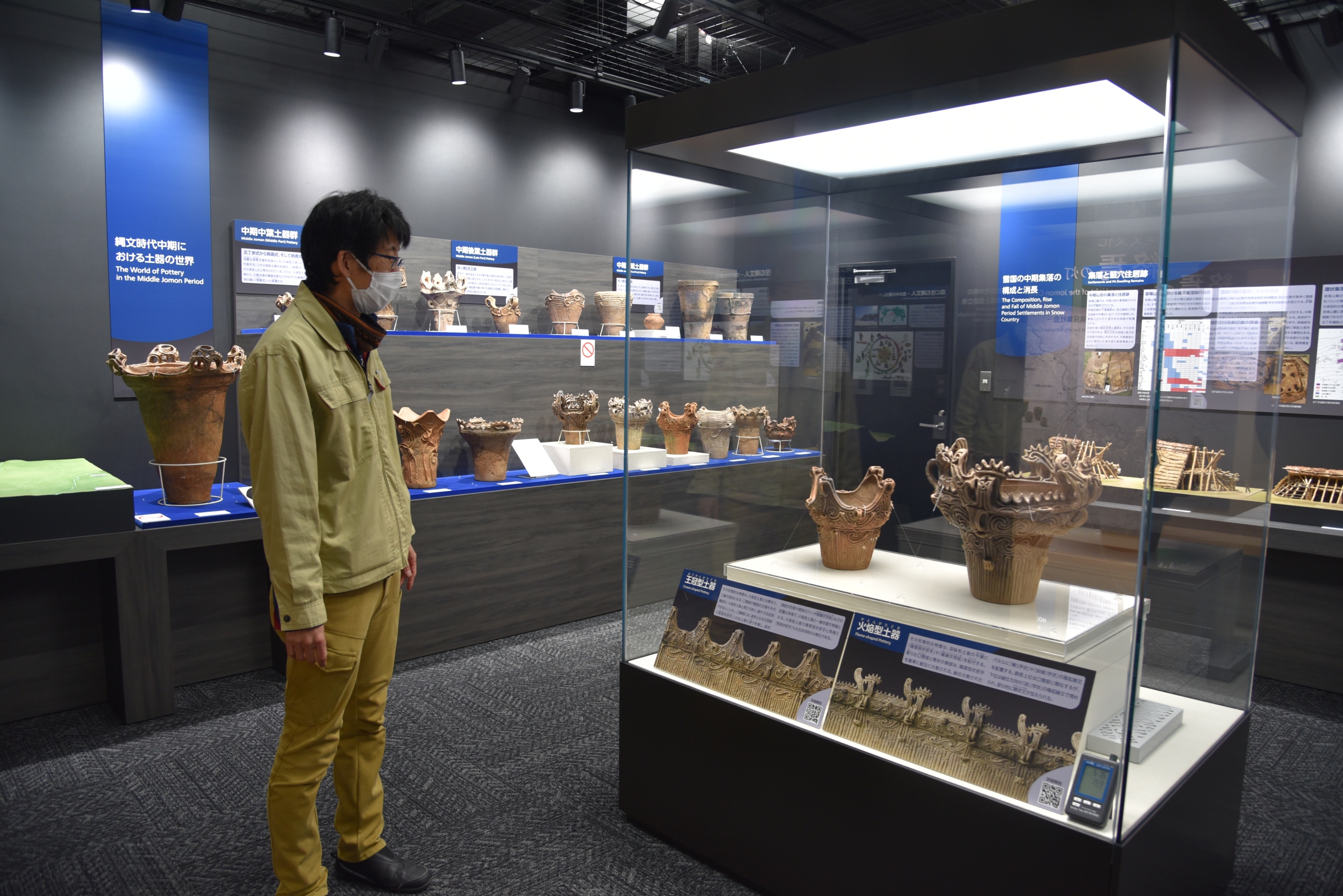 この部屋では縄文時代の中期中葉土器群に分類される火焔型土器だけでなく、その後の中期後葉土器群、中期末葉土器群なども展示されている。後葉以降になるとさすがに過剰な装飾は影を潜め、シンプルなデザインになり、実用性が高められたものになっているのがわかる。